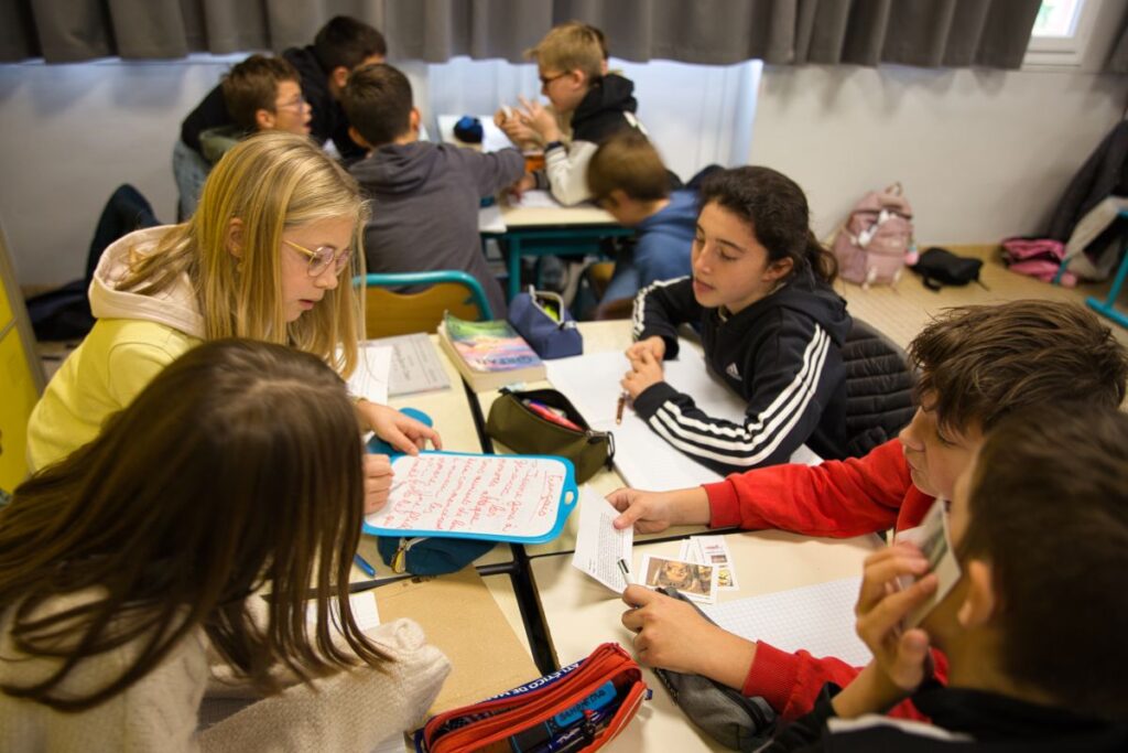 Gaëlle Tertrais a par ailleurs animé un atelier d’écriture avec chacune des classes ; les groupes ont composé à partir d’éléments proposés par l’auteure, issus du roman : lieu de l’action, personnages, objets, extraits à prolonger etc… Difficile de se mettre d’accord tant les idées jaillissent . Nos jeunes chevaliers ont saisi la plume mais ce n’est pas un vain combat qu’ils auront livré avec les mots. Comme Orfan et ses amis qui unissent leurs mains pour vaincre les dangers, nos apprentis écrivains ont uni leur talent. Bon nombre d’entre eux envisagent de poursuivre dans la voie de l’écriture, et les tomes de la série « Orfan » garniront le pied des sapins prochainement .