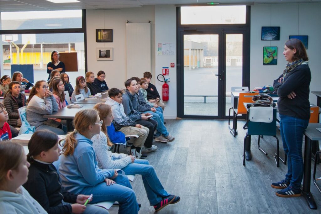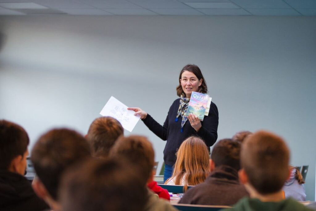 Le lundi 24 novembre 2025, l’auteure Gaëlle Tertrais est venue rencontrer les sixièmes B,C,E et G. Les questions ont fusé pour connaître tout du métier d’écrivain, des étapes de la fabrication du livre mais surtout pour en savoir davantage sur Orfan, jeune héros du roman éponyme, dont nos jeunes lecteurs ont dévoré les aventures avec passion.